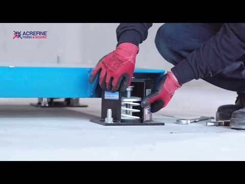 Acrefine ASI-V type seismic vibration isolator is designed to restrain lateral and vertical equipment movement caused by external forces such as high winds or seismic events. The isolator housing is fabricated from high quality steel. Equipment motion is limited to 6 mm (1/4″) which also ensures out-of-contact operation under normal conditions. The operational height of the isolator is fixed, and any adjustment can be made via the adjustment nut located under the equipment bracket.